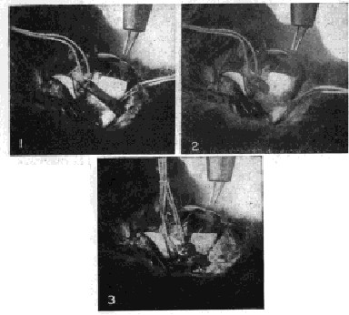 1 – The inferior oblique muscle has been exposed and two sutures are attached to it. Electrical stimulation of the eyeball produces accommodation as demonstrated by simultaneous retinoscopy.