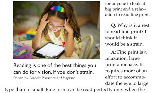 Gloria Ginn, a longtime vision improvement teacher, put together this collection of questions and answers about reading that Bates published at the end of various issues of his Better Eyesight Magazine.