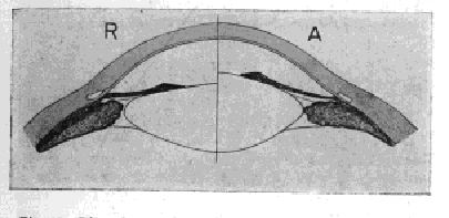 R is supposed t be the resting state of the lens, in which it is adjusted for distant vision. In A the suspensory ligament is supposed to have been relaxed through the contraction of the ciliary muscle, permitting the lens to bulge forward by virtue of its own elasticity.