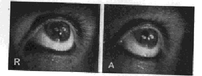 R, rest; A, accommodation. The image is smaller in A, but the change is so slight as to be scarcely noticeable, showing that the alteration in the shape of the cornea during accommodation is very slight. For this reason the ophthalmometer, with its small image, has been thought to demonstrate that the cornea did not change during accommodation.