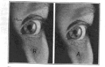 R, rest; A, accommodation. During accommodation the front of the sclera becomes more convex, because the eyeball has elongated, just as a camera is elongated when it is focussed upon a near object. The spot of light on the cornea is an accidental reflection.