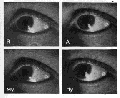 When an effort was made to see at a distance the image reflected from the side of the sclera was larger than the image obtained when the eye was at rest, indicating that this part of the sclera had become less convex or flatter, because of elongation of the eyeball. The image obtained during normal accommodation was also larger than when the eye was at rest, indicating again a flattening of the side of the sclera. The image obtained, however, when an effort was made to see near was much smaller than any of the other images, indicating that the sclera had become more convex at the side, a condition which one would expect when the eyeball was shortened, as in hypermetropia.