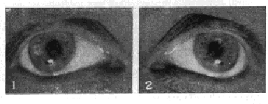This picture is shown to illustrate the fact that it is possible to get a reflection from any reflecting surface of the eyeball without reflections from the other parts, although these may be exposed. This is done by changing the angle of the light to the eye. In No. 1 observations of the eye at the time the picture was taken demonstrated that the image was from the iris, not from the cornea, and the fact is also apparent in the picture. (Compare the image with the corneal reflection in Fig. 28.) In No. 2, where the image overlaps the margin of the pupil, the fact that the reflection is from the iris is manifest from the circumstance that only part of the filament is seen. If it were from the cornea, the whole of it would be reflected. Note in this picture that there is no reflection from the lens. The images on the iris did not change their size or shape during accommodation, demonstrating again that the lens, upon which the iris rests, does not change its shape when the eye adjusts itself for near vision.
